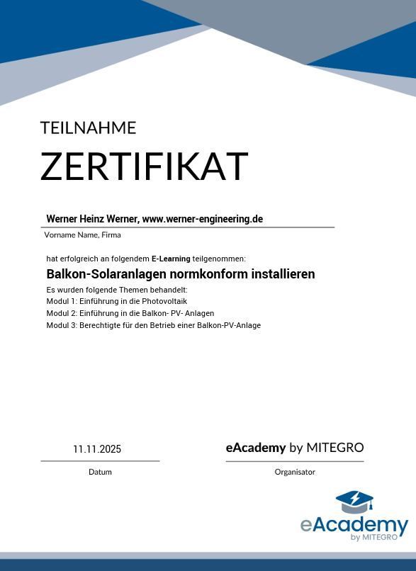WERNER ENGINEERING bestätigt Kompetenzen im Bereich PV-Balkon-Anlagen durch Zertifikat