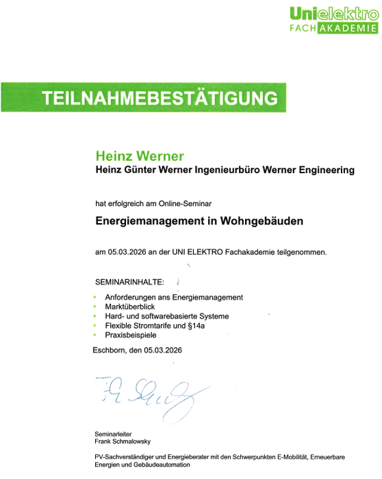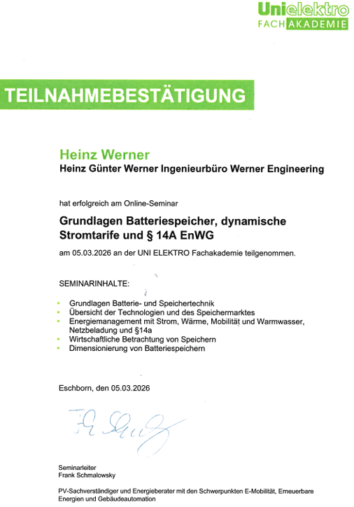 WERNER ENGINEERING bestätigt Kompetenzen im Bereich Elektrotechnik durch Zertifikat