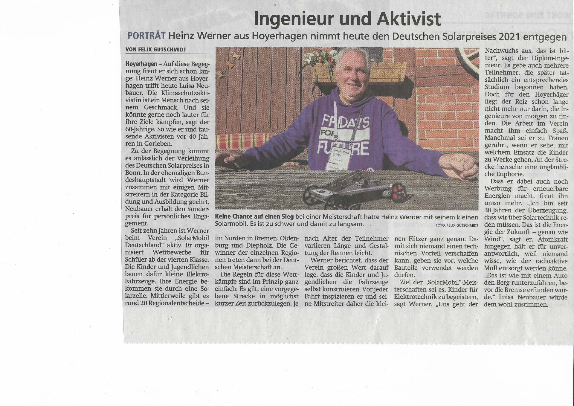Heinz Werner und seine Mitstreiter wird der Deutscher Solarpreis 2021 in der Kategorie Schule und Ausbildung für die Durchführung der Solarmobil Meisterschaften (Deutsche Meisterschaft regionaler SolarCup-Rennen) verliehen.